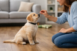 آموزش نشستن و فرمان های پایه برای توله سگ
